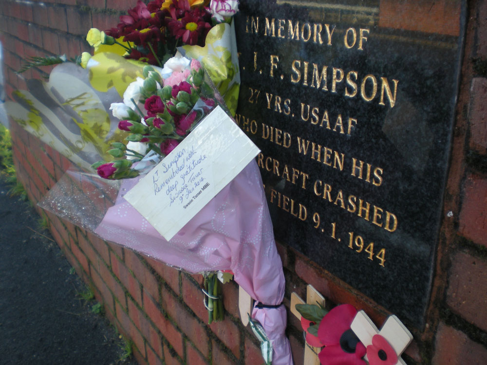 The plaque remembering 2nd Lieut Jay Simpson of the US Air Force, who crashed while test flying a plane over Saughall Massie in 1944, now has a brass bar attached to the base to facilitate the placing of poppies on Remembrance Day. This has also been used by the Warplane Wreck Investigation Group (WWIG) to leave a recent floral tribute on the 9th January 2014, at 15.08 pm, marking the date and time of the crash. WWIG are based at Fort Perch Rock in New Brighton where the engine from the crashed plane forms part of their display. The group were also responsible for installing the polished stone plaque which is located on the new bridge over the Arrowe Brook, on the by-pass south of the village. 2nd Lieut Simpson was laid to rest at the American Cemetery in Madingley, Cambridge.