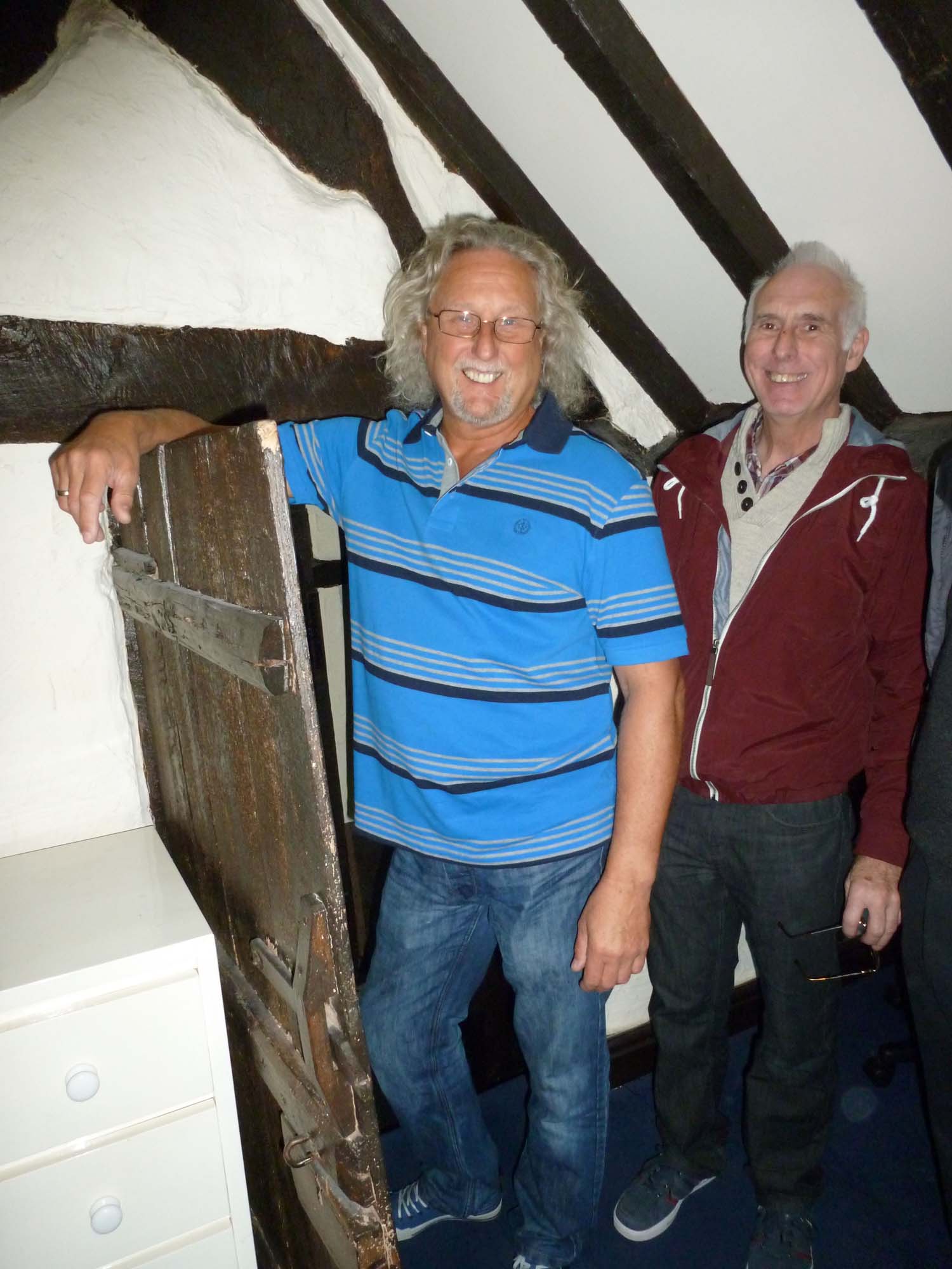 Brian Meadows showing John Kennedy of the Wirral Tuesday History Group the small door in the upper rooms of the cottage. The door provides an escape route in case of fire in that side of the house.