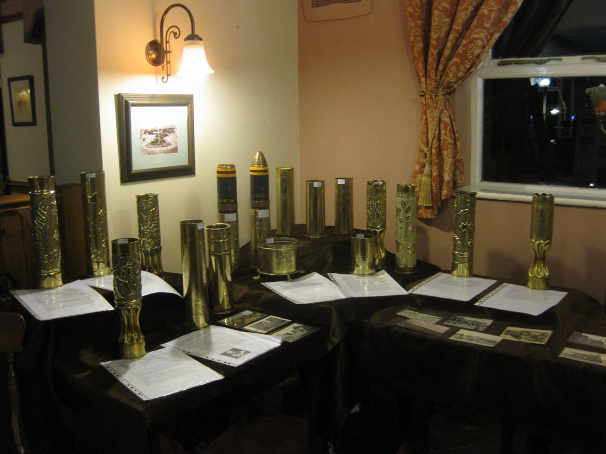 A display of trench art and WW1 memorabilia including newspapers was also on display. Trench art was done by the men in the trenches during "rest" periods and they often used spent shell cases and etched patterns on to them. They are frequently beautiful and the collection included two very rare items believed to be done by Chinese and Indian soldiers. They were much admired by members of the audience during the interval. With over fifty people attending the talk, the Society made a surplus so that over £60 will be going to the Help for Heroes fund. Thanks to all those who attended and gave so generously.